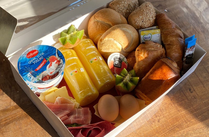 De ontbijtbox bestaat uit verse jus d'orange, yoghurt, diverse broodjes, beleg en een eitje.